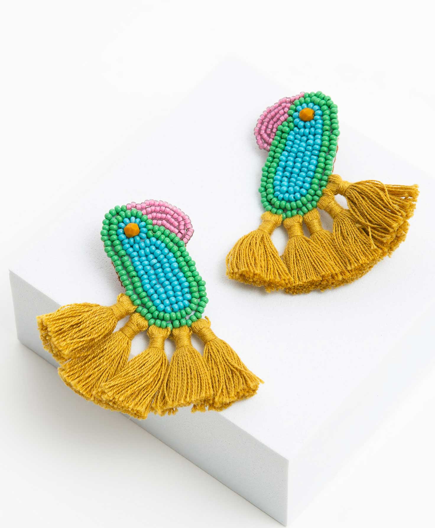 We packed plenty of personality into these vibrant beaded earrings! Dainty glass beads in tropical shades combine to create a whimsical bird design that wouldn't be complete without a pop of festive fringe.