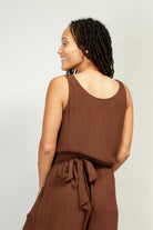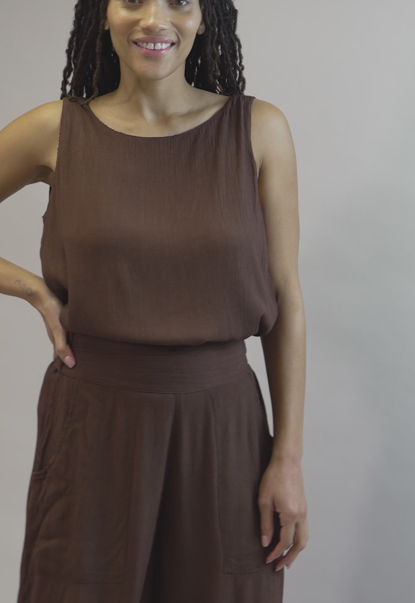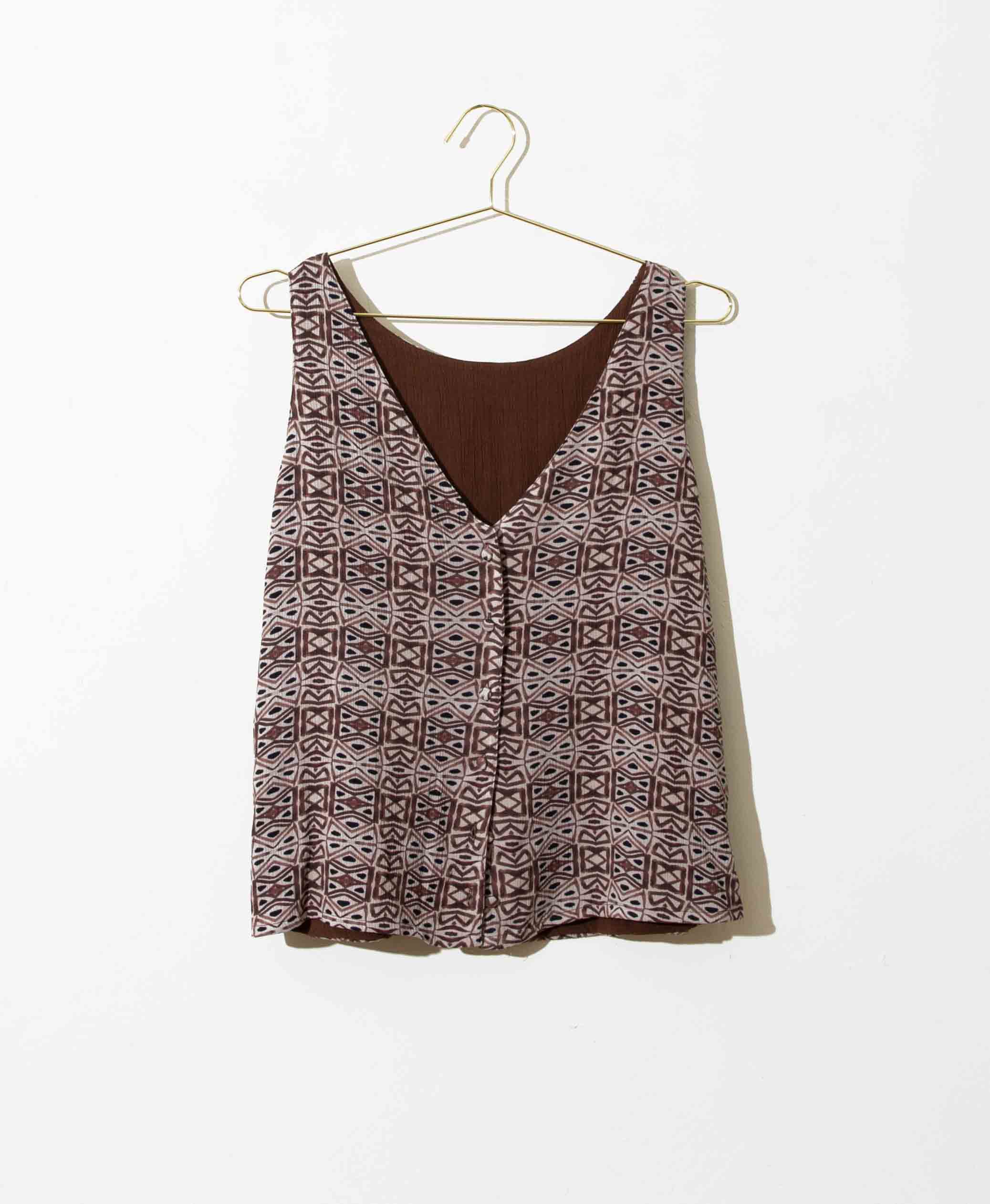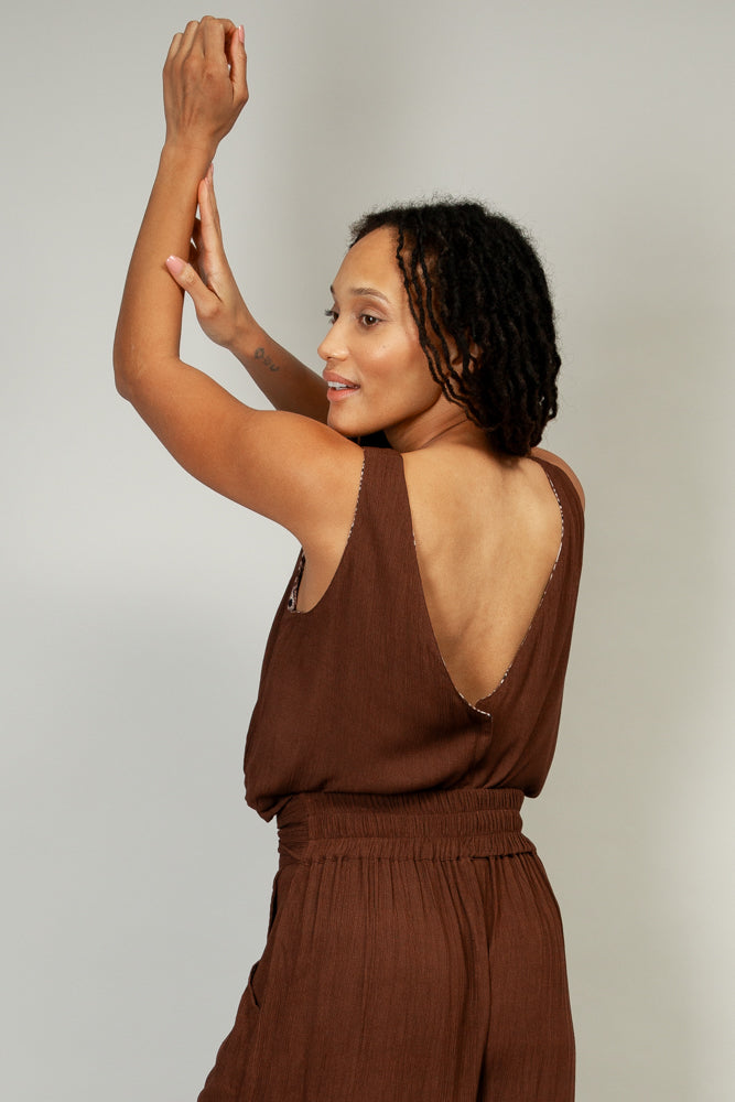 You know those tops that feel as comfy as pajamas, but make you look like you have it all together? This is one of those. With a traditional Indian printed pattern on one side and solid back on the other, this brown earth-tone tank reverses inside and out plus front and back for a truly versatile top. Our Bagru pattern is named for the wooden blocks our Artisan Partners carve for use in traditional block printing.