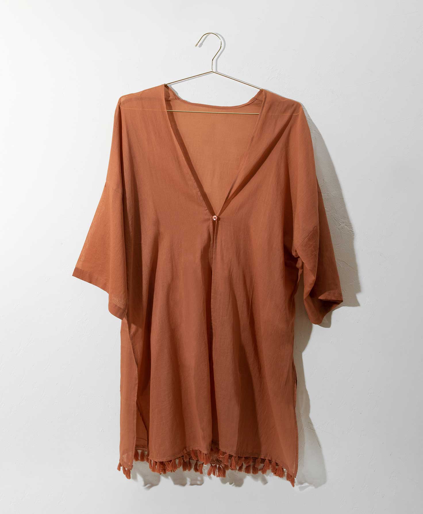 This cool cotton duster is a dream for taking a trip to the shore or lounging around the house pretending you are. Its terracotta color palette is endlessly flattering and versatile with a bohemian vibe. Soft tassels complete the free-spirited look.