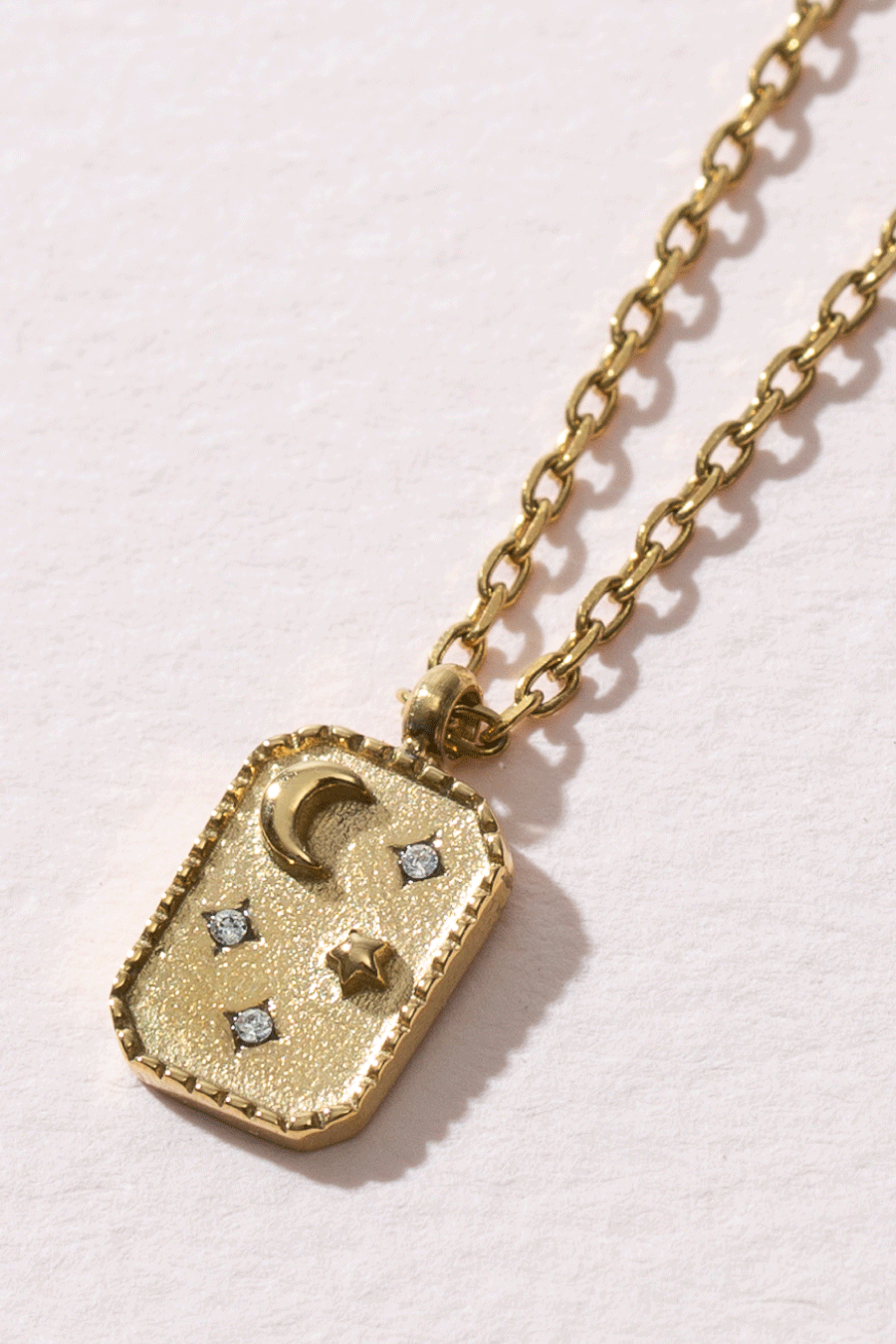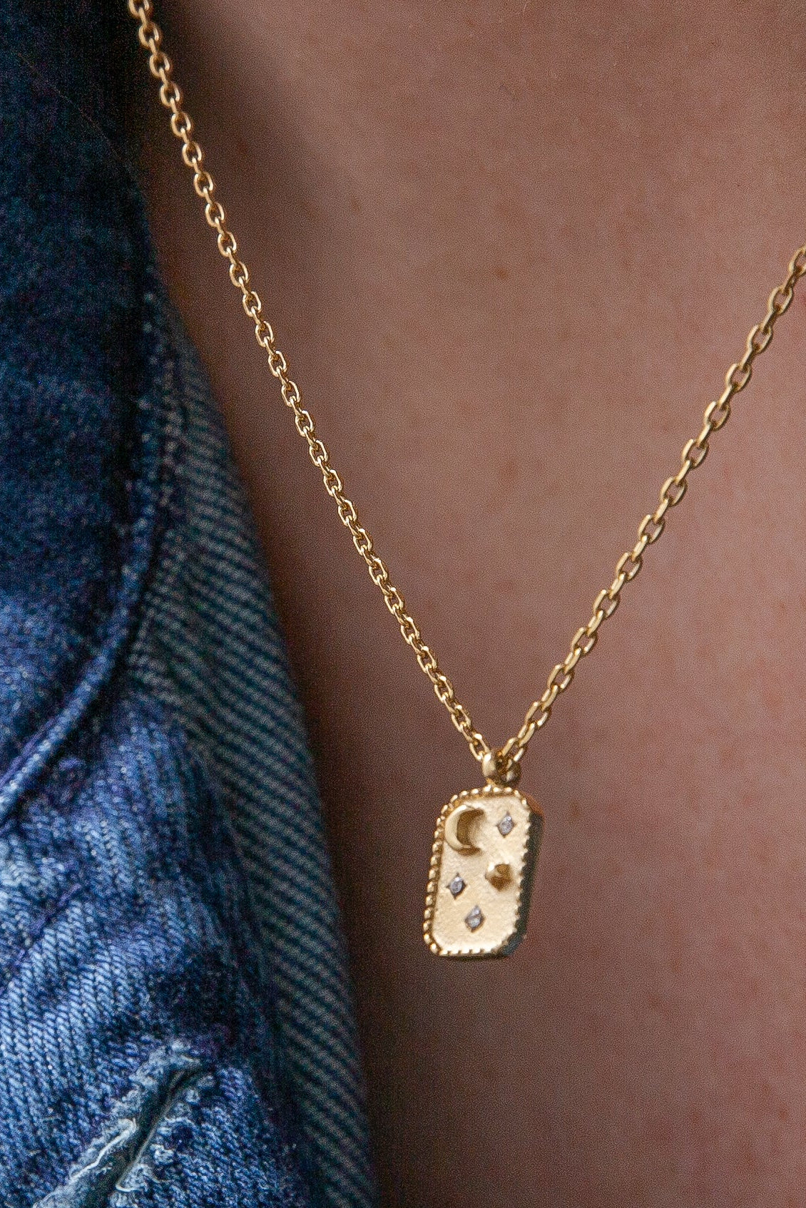 The Reach for the Stars Necklace features a textured gold-plated stainless steel pendant stamped with a crescent moon and tiny star details, accented with subtle crystal-like stones that catch the light. On the back, the words “reach for the stars” are engraved — a hidden message of encouragement meant just for you.