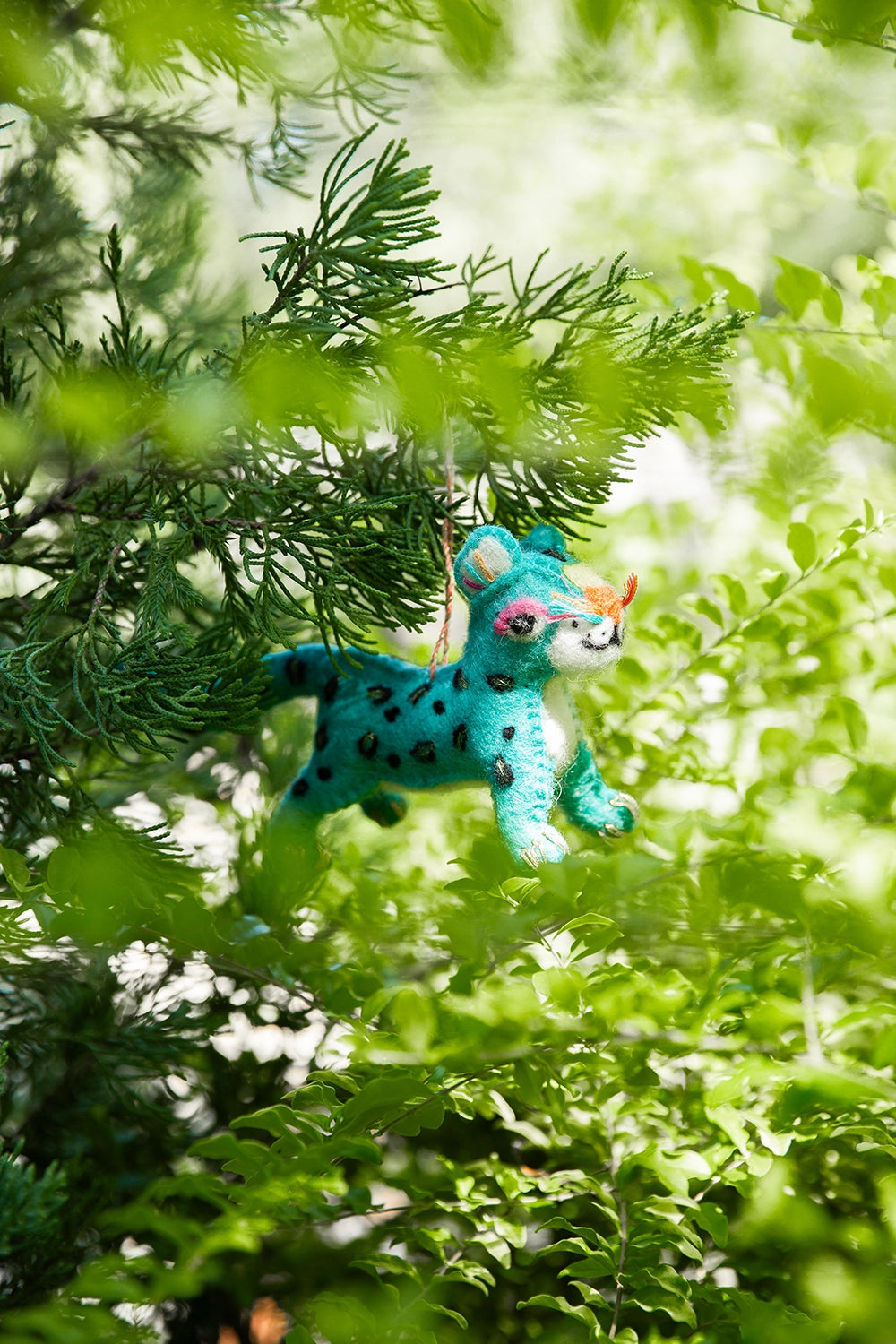 • The Lucky Leopard Ornament is composed of brightly colored pieces of wool stitched together to form a three dimensional leopard. The body is turquoise, and the snout, belly, and inner ears are white. There is an eye and eyelashes stitched onto the face, and black and gold spots stitched all over the body. The ornament hangs from a loop composed of orange thread.