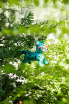 The Lucky Leopard Ornament is composed of brightly colored pieces of wool stitched together to form a three dimensional leopard. The body is turquoise, and the snout, belly, and inner ears are white. There is an eye and eyelashes stitched onto the face, and black and gold spots stitched all over the body. The ornament hangs from a loop composed of orange thread.